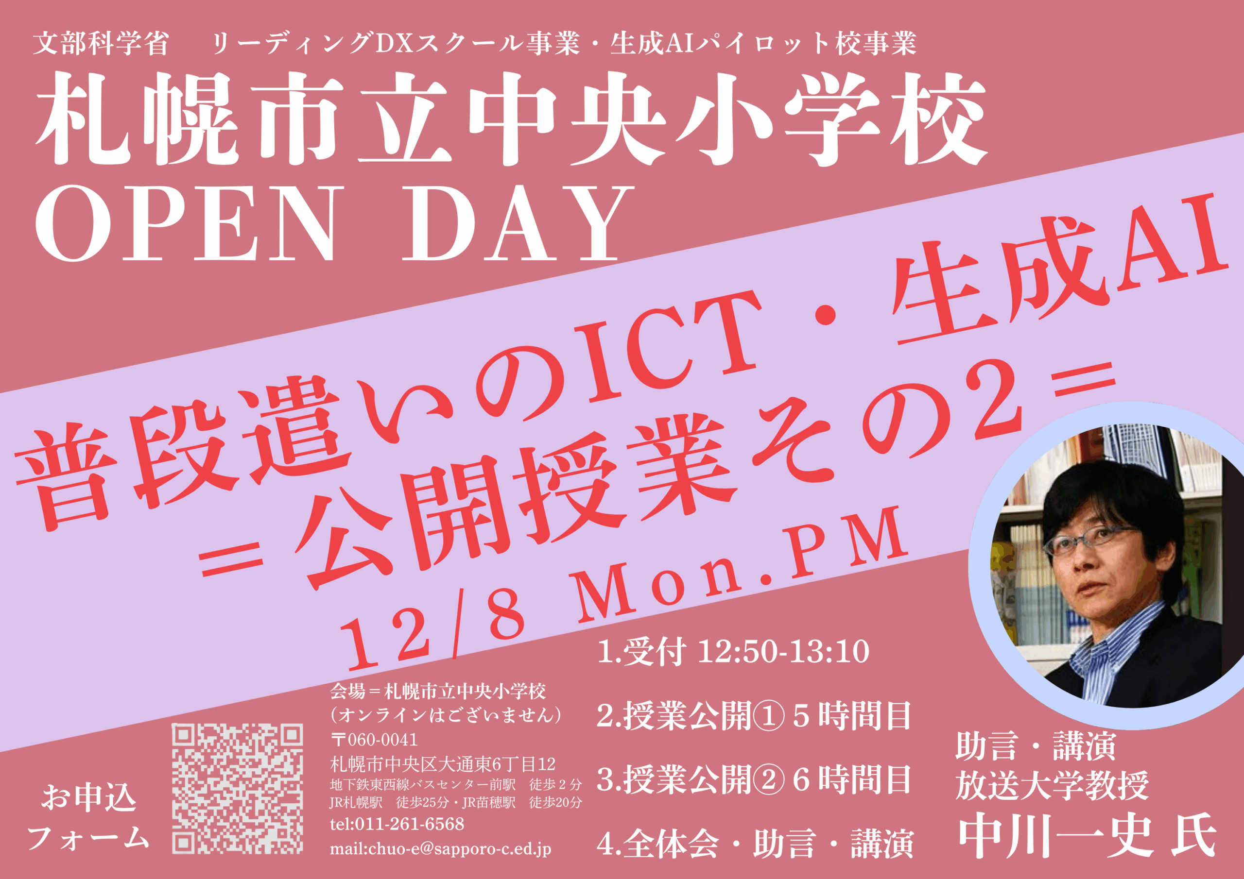 本校は文部科学省リーディングDX スクール事業ならびに生成AI パイロット校事業の指定を受け、「普段遣いのICT・生成AI」をテーマに、公開授業および講演会を下記のとおり開催いたします。当日は放送大学中川教授をお招きして御助言・御講演いただく予定です。日頃よりICT や生成AI の教育活用にご関心をお持ちの皆様にとりましても、貴重な学びの機会となることと存じます。
