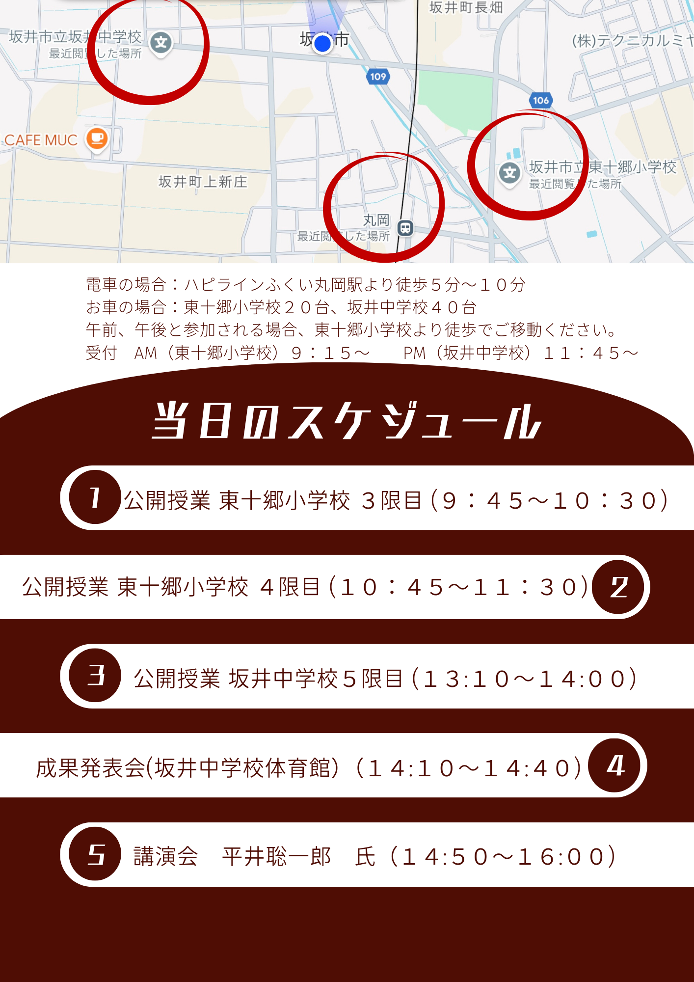 午前:坂井市立東十郷小学校、午後:坂井市立坂井中学校