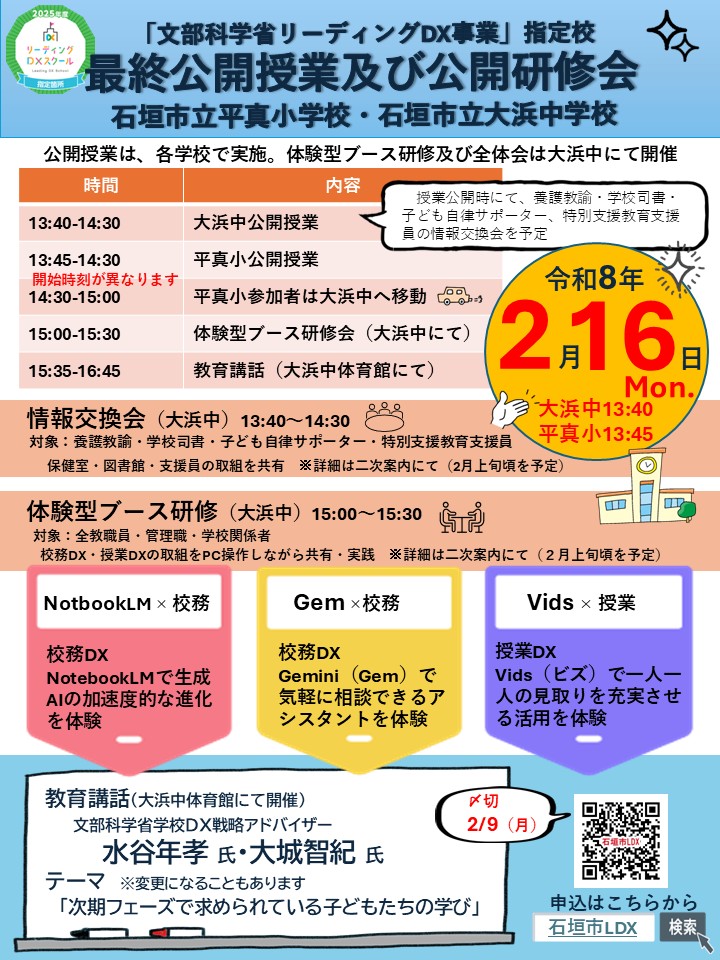 石垣市では、文部科学省「リーディングDXスクール事業」の指定校である石垣市立大浜中学校・石垣市立平真小学校において、今年度の取組の成果を広く共有するため最終公開授業および公開研修会を開催いたします。