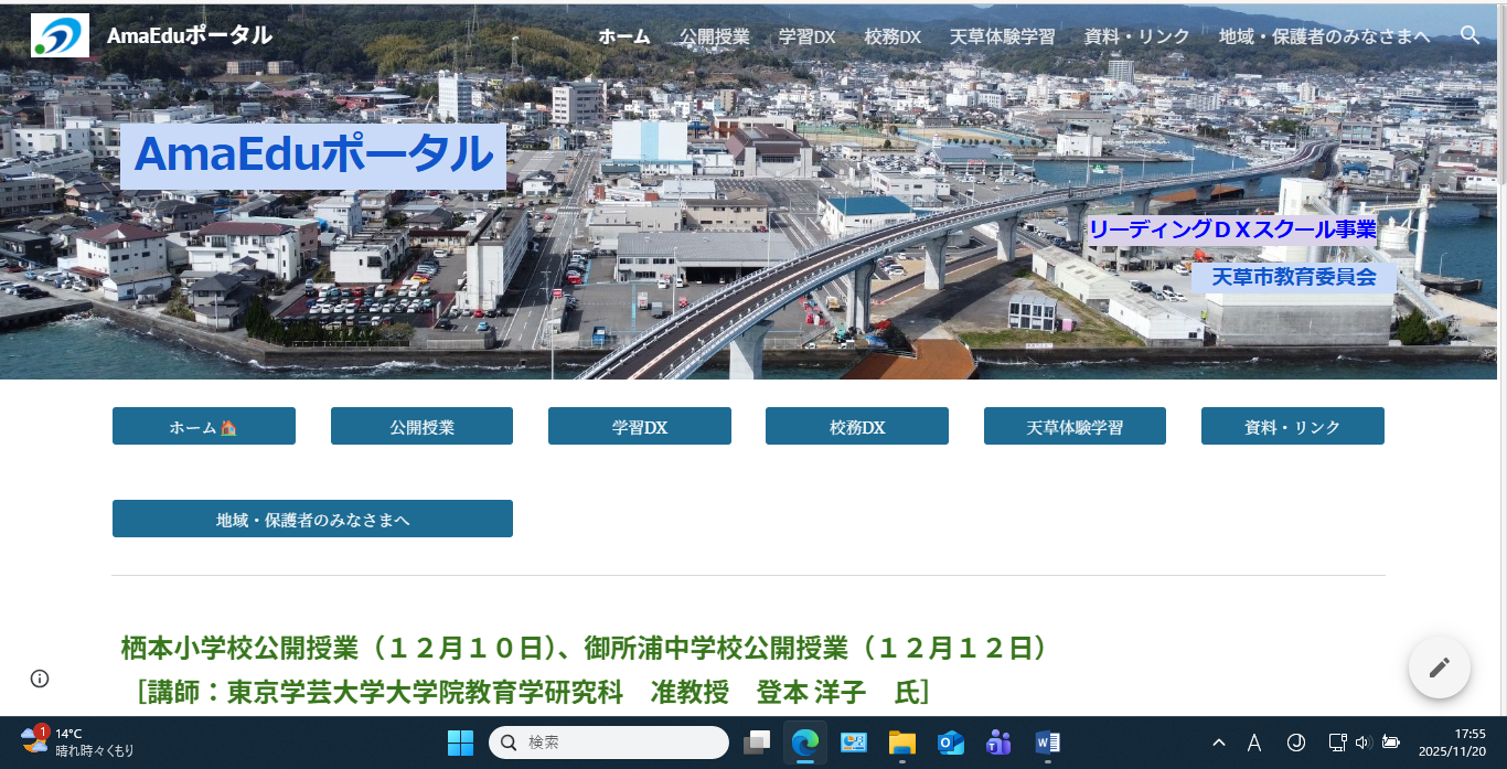 天草市は、「地理的なへき地はあっても、教育にへき地はない、あってはならない。」という強い信念のもと、「教師主導の『教える』教育」から「学習者主体の『委ねる』教育」への転換を目指しています。今年度は、本渡南小学校と本渡中学校、亀川小学校と稜南中学校の4校を指定校、残る26校を協力校と位置付け、市内すべての小・中学校で学びのDXに取り組んでいます。特設サイトでは、学校の取組の様子や公開授業の案内を掲載しています。