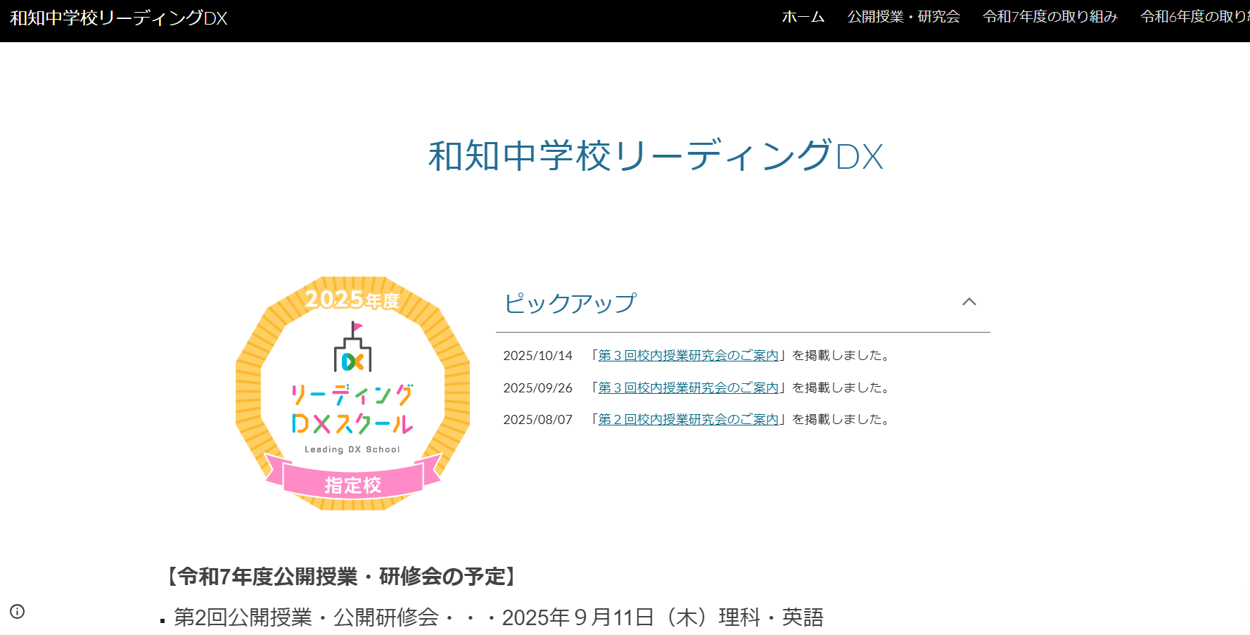 和知中学校では、「汎用的な資質能力を意識した深い学びの実現」を研究主題として授業改善を進めております。本特設サイトには、リーディングDXスクール事業における取組の様子や、公開授業等の情報、資料等を掲載しています。