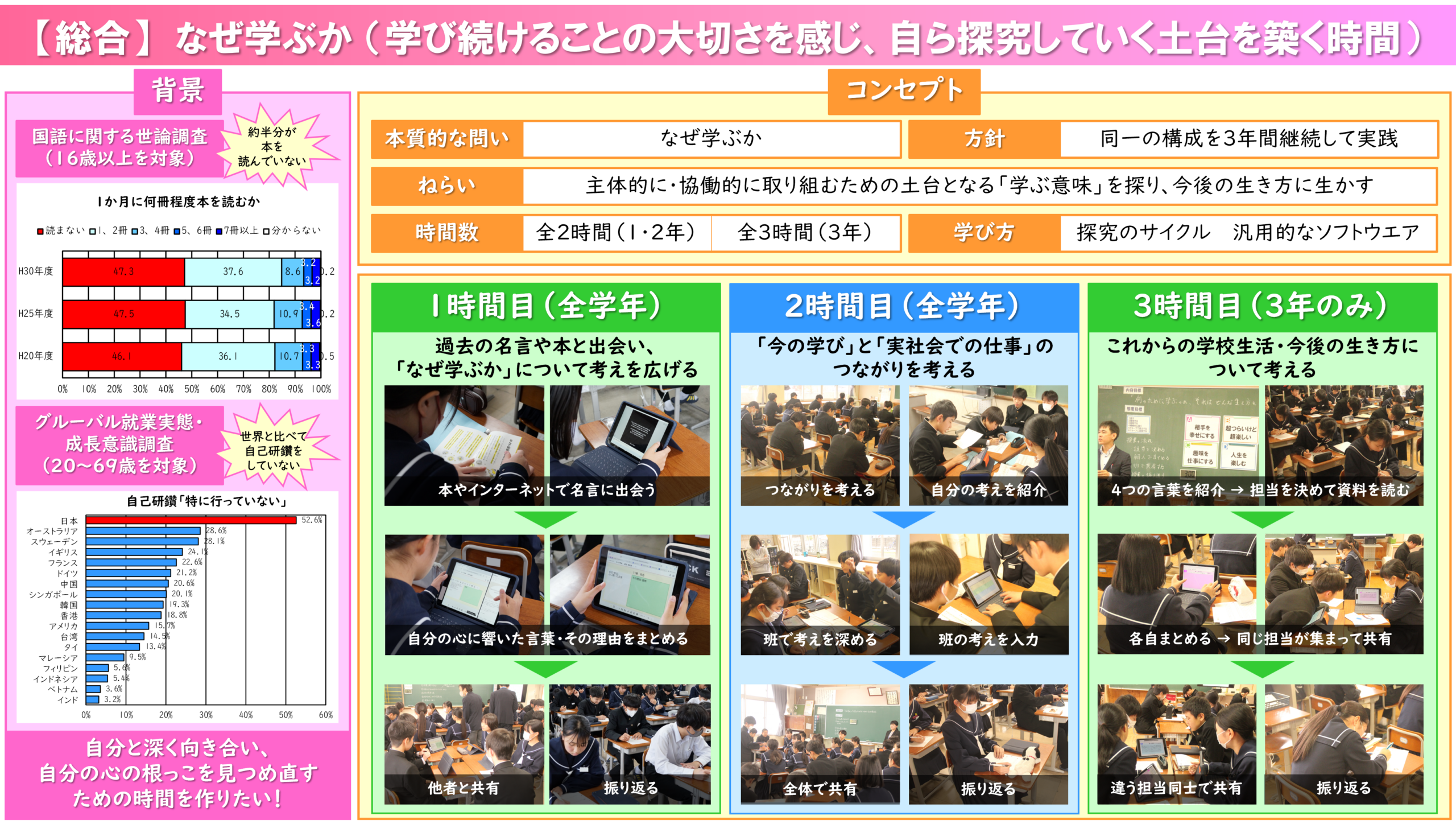 本校では、生徒が主体的に・協働的に学ぶための根幹となる「なぜ学ぶか」という本質的な問いに焦点を当て、生徒が学び続けることの大切さを感じ、将来にわたって自ら探究していく土台を築いていくことをねらいとして2年前より全校で取り組んでいます。